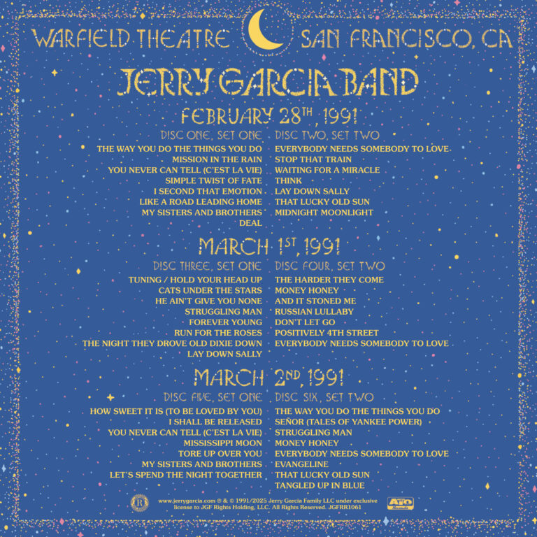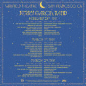 The run closes on March 2 with another strong show from start to finish, featuring a setlist that balances hard-hitting ballads with roof-raising rave-ups. Dylan remains well represented with a moving version of "I Shall Be Released," a dark and spooky "Señor," and a barn-burning "Tangled Up in Blue." With performances like these, it's easy to see how The Warfield cemented its place in the hearts and minds of Garcia and the greater Deadhead community.
